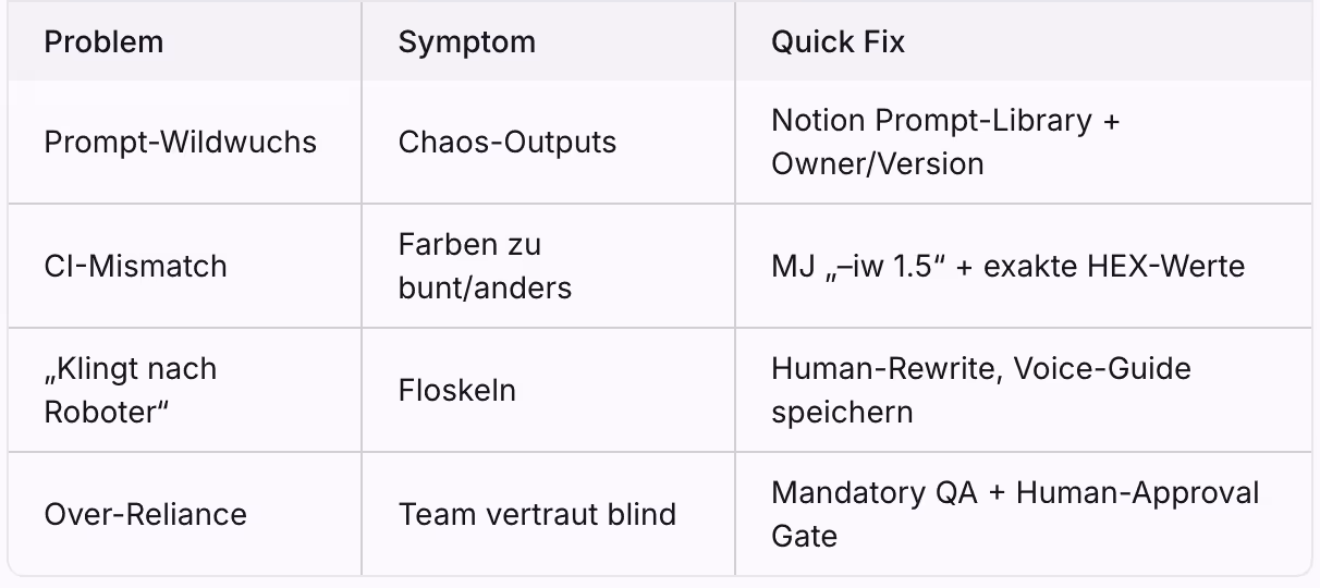 Checkliste: ☑ Faktencheck Perplexity (< 2 % Halluzination) ☑ Bildästhetik + Brand CI durch Art Director ☑ Storyflow durch CD Abgabeformate: PDF + 3-Min-Loom-Video = Kunde kann asynchron entscheiden.