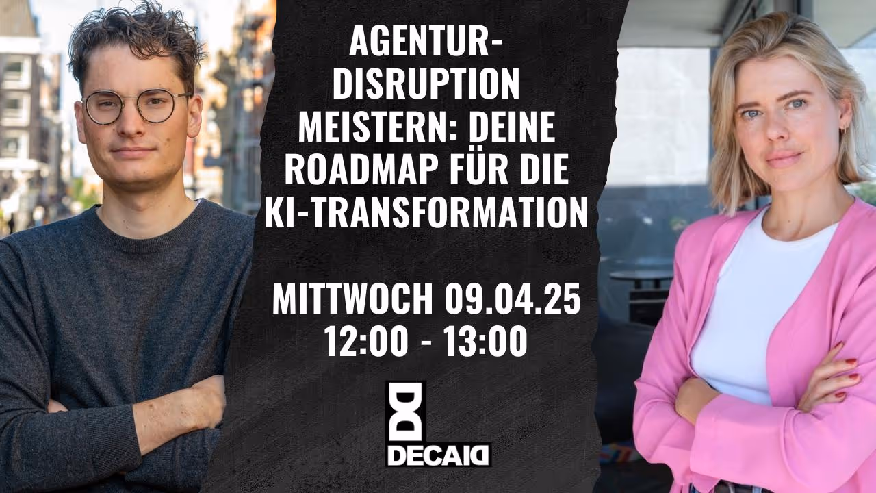 Am 09. April 2025 liefern wir von 12:00 bis 13:00 Uhr die konkrete Strategie, nach der Agenturen suchen. In diesem LinkedIn Live-Webinar zeigen wir dir, wie dein Führungsteam die KI-Revolution nicht nur bewältigt, sondern sie als Wettbewerbsvorteil nutzt.