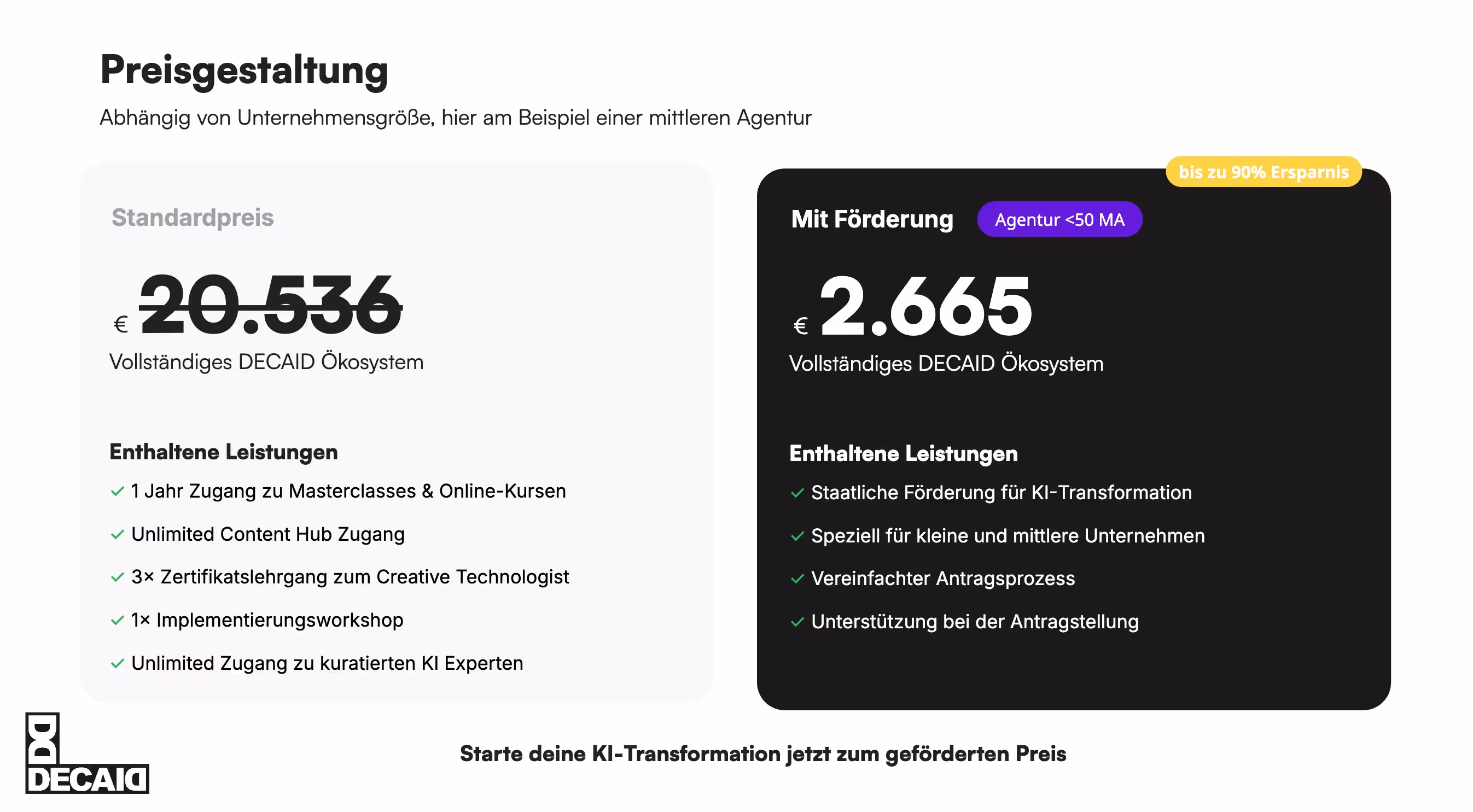 Der „Creative Technologist“ ist unser exklusives Offering für Agenturen und Marketing-Teams, die kreative Exzellenz mit GenAI-gestützter Prozessautomation verbinden wollen. Teil des Pakets sind praxisnahe Zertifikatslehrgänge, kuratierte Expert:innenzugänge und Implementierungsworkshops, die Ideen schnell in produktive Workflows überführen. Ergebnis: messbar schnellerer Content-Output, konsistente Qualität und skalierbare Margen durch standardisierte SOPs und intelligente Automatisierung.