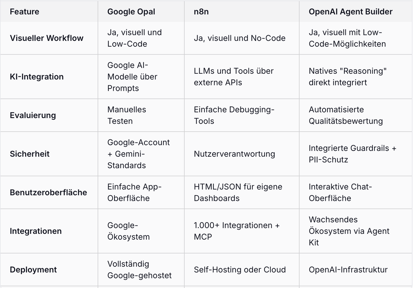 Deshalb ordnen wir heute drei der meistgehypten Plattformen ein: OpenAI Agent Builder, n8n und Google Opal. Keine Marketing-Versprechen, keine oberflächlichen Feature-Listen – sondern eine ehrliche Einschätzung, die dir hilft, die richtige Entscheidung für deine spezifische Situation zu treffen.
