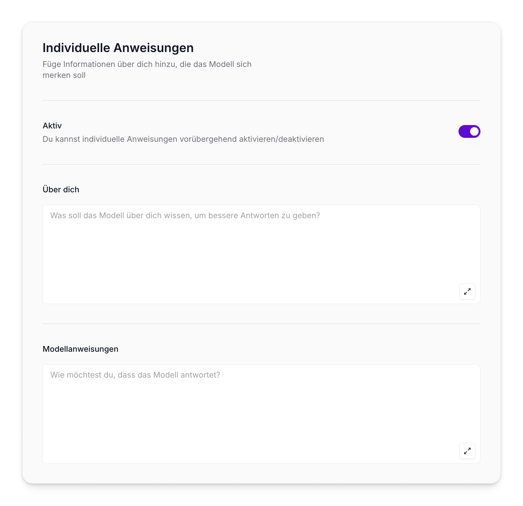 Pro-Tipp: Global vs. SpezifischBedenke, dass diese Anweisungen global auf alle deine neuen Chats angewendet werden. Hinterlege hier also nur Regeln, die wirklich immer gelten sollen. Wenn du Anweisungen nur für ein bestimmtes Thema oder Projekt benötigst, ist es besser, ein spezifisches Projekt/Assistent/GPT anzulegen. Dort kannst du kontextbezogene Anweisungen hinterlegen, die nur für Chats innerhalb dieses Projekts gelten.